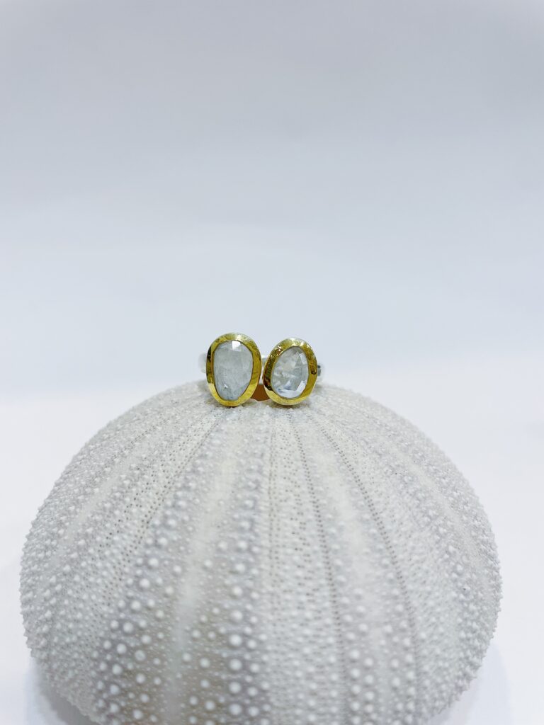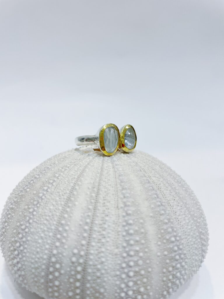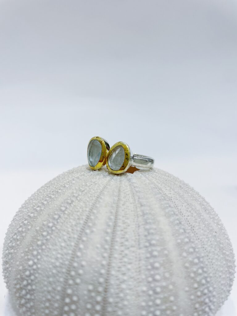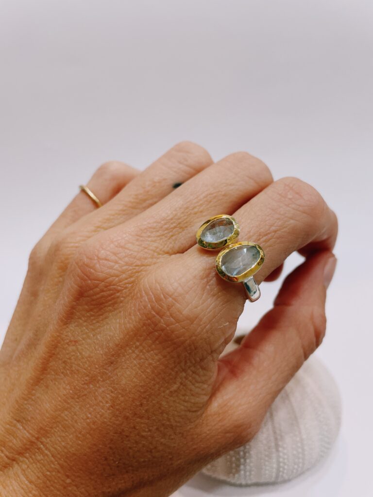 Anillo con dos aguamarinas engastadas en Plata de Ley 925 con reborde bañado en oro 24k.