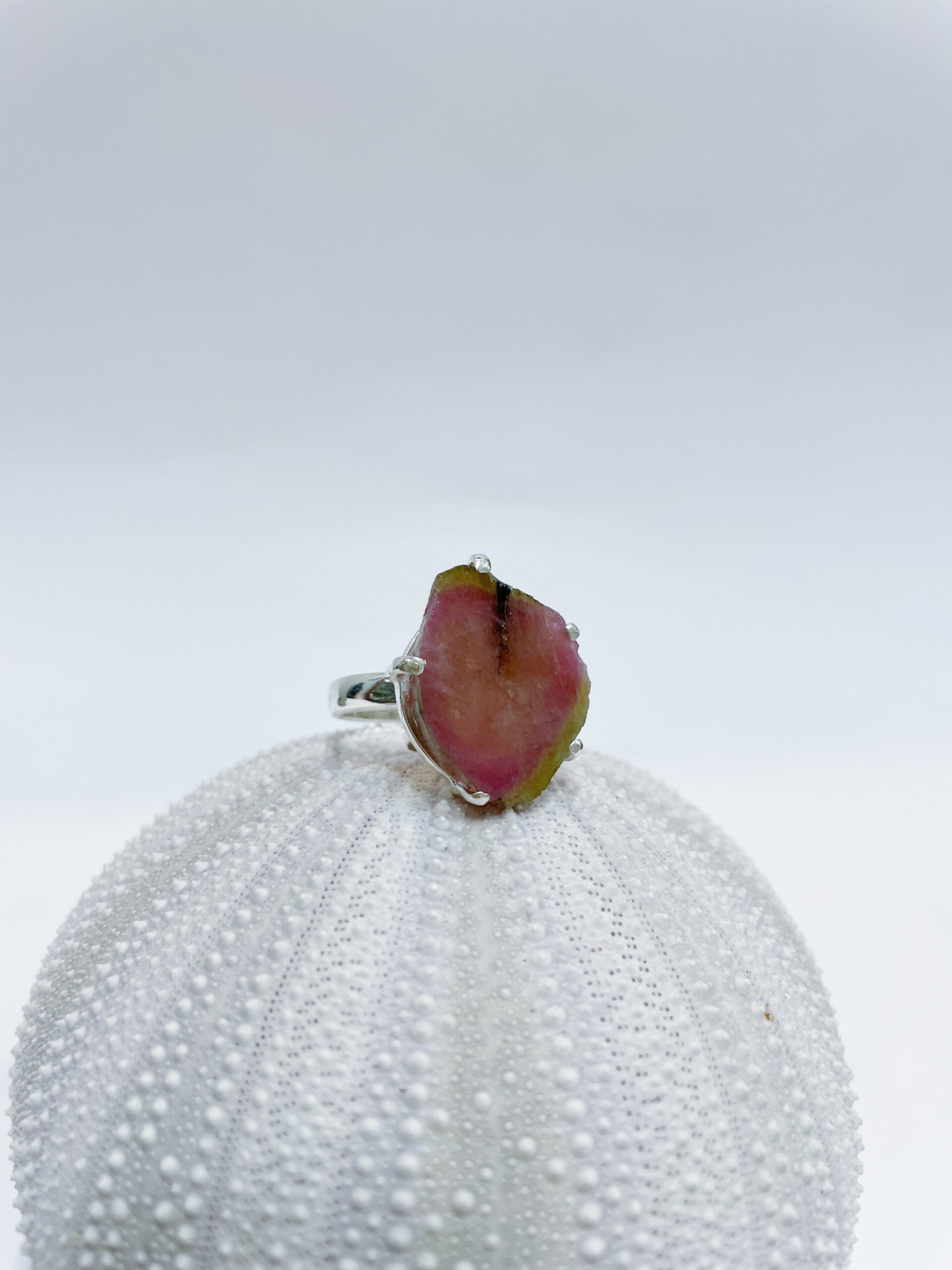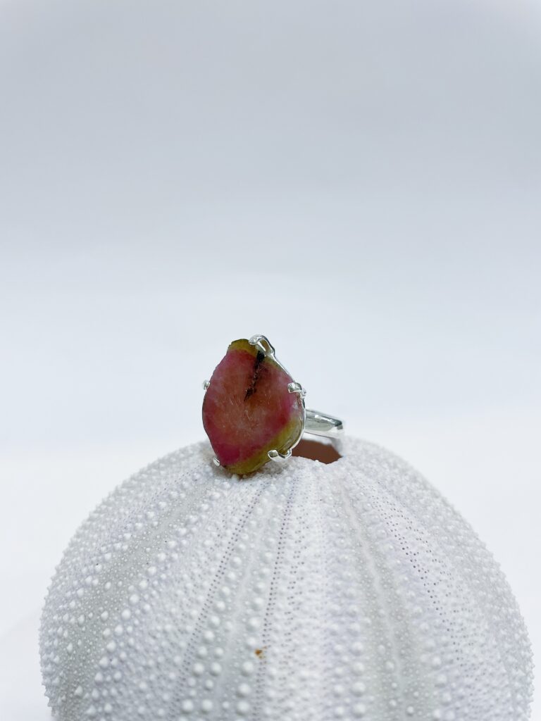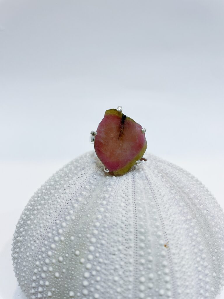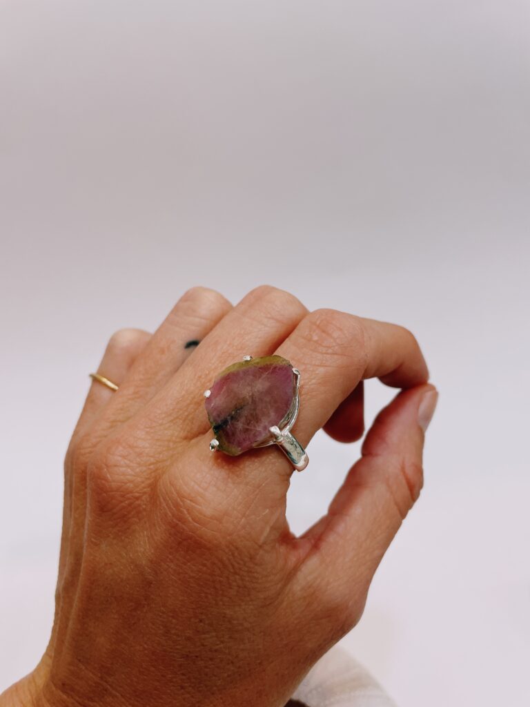 Anillo de Turmalina sandía semi bruto, es en su mayoría rubelita, turmalina rosa. Natural.
