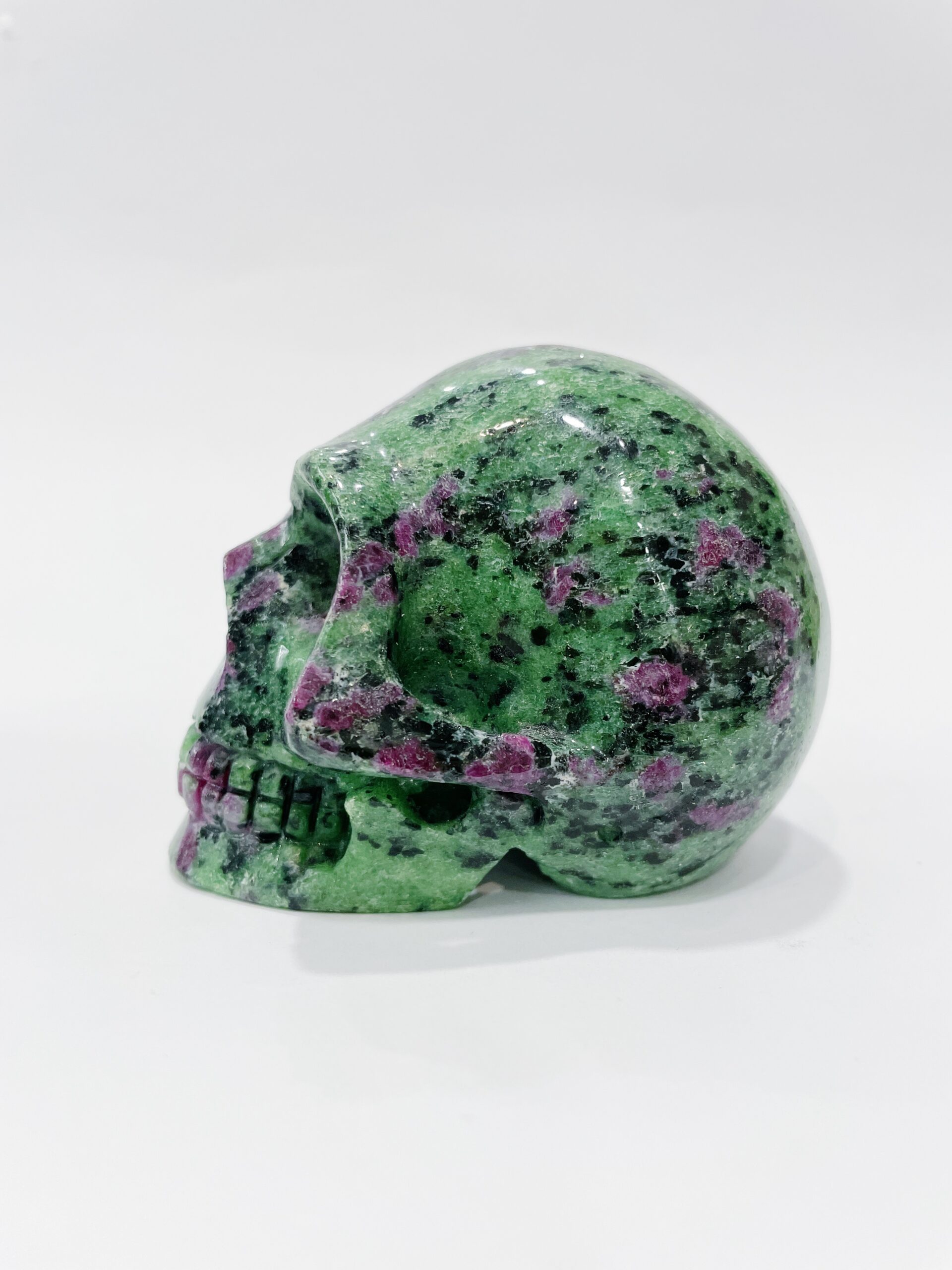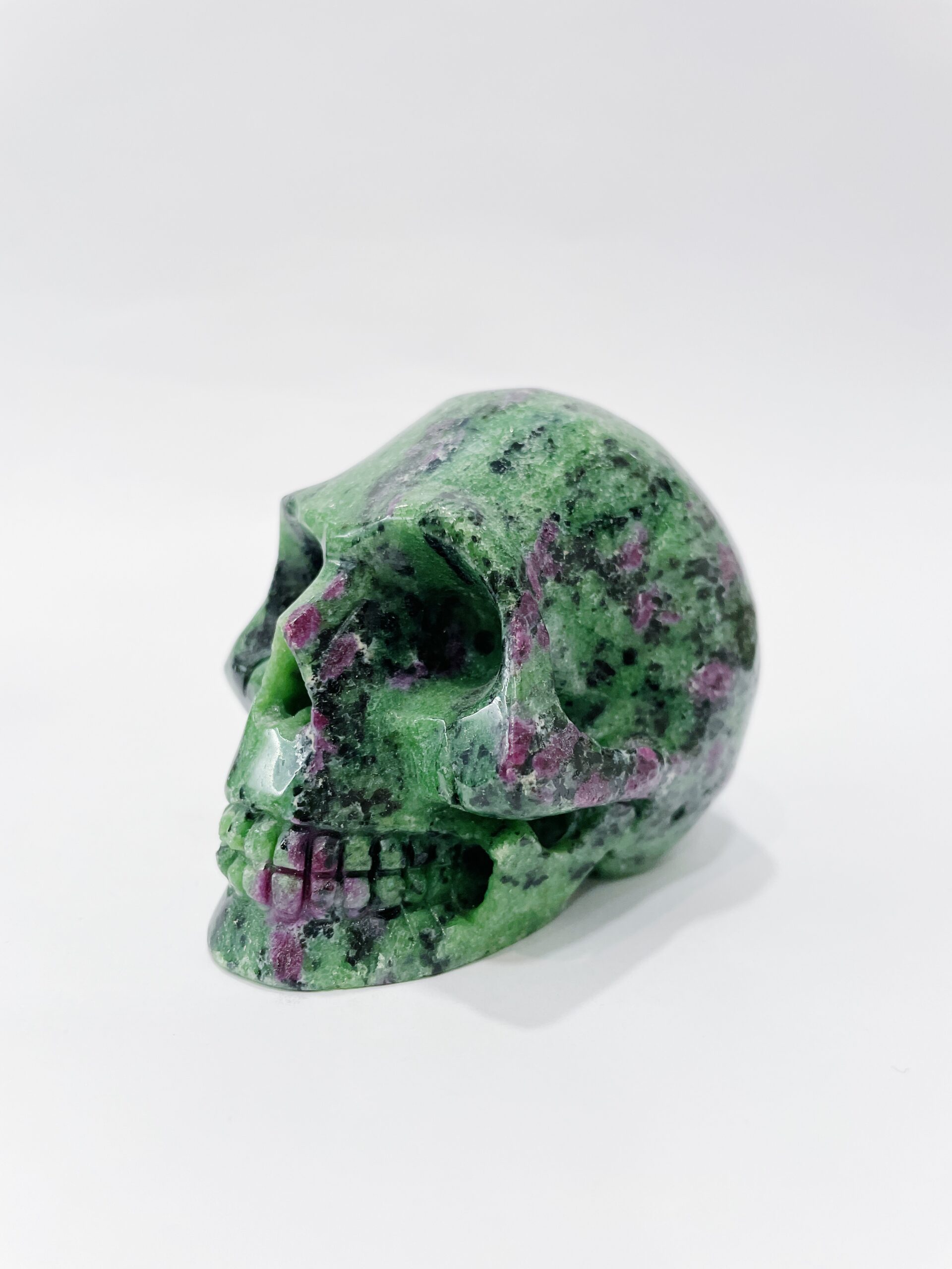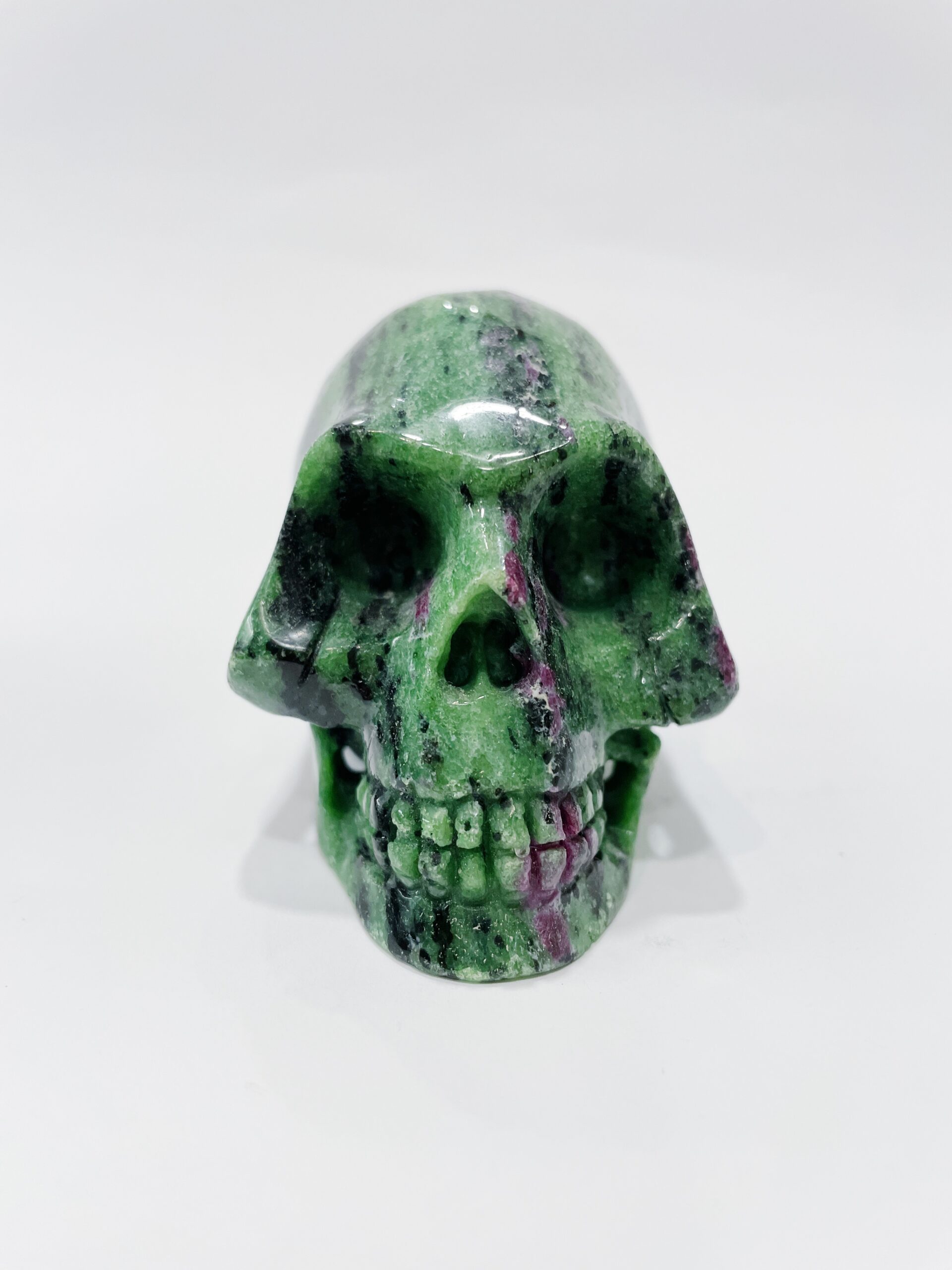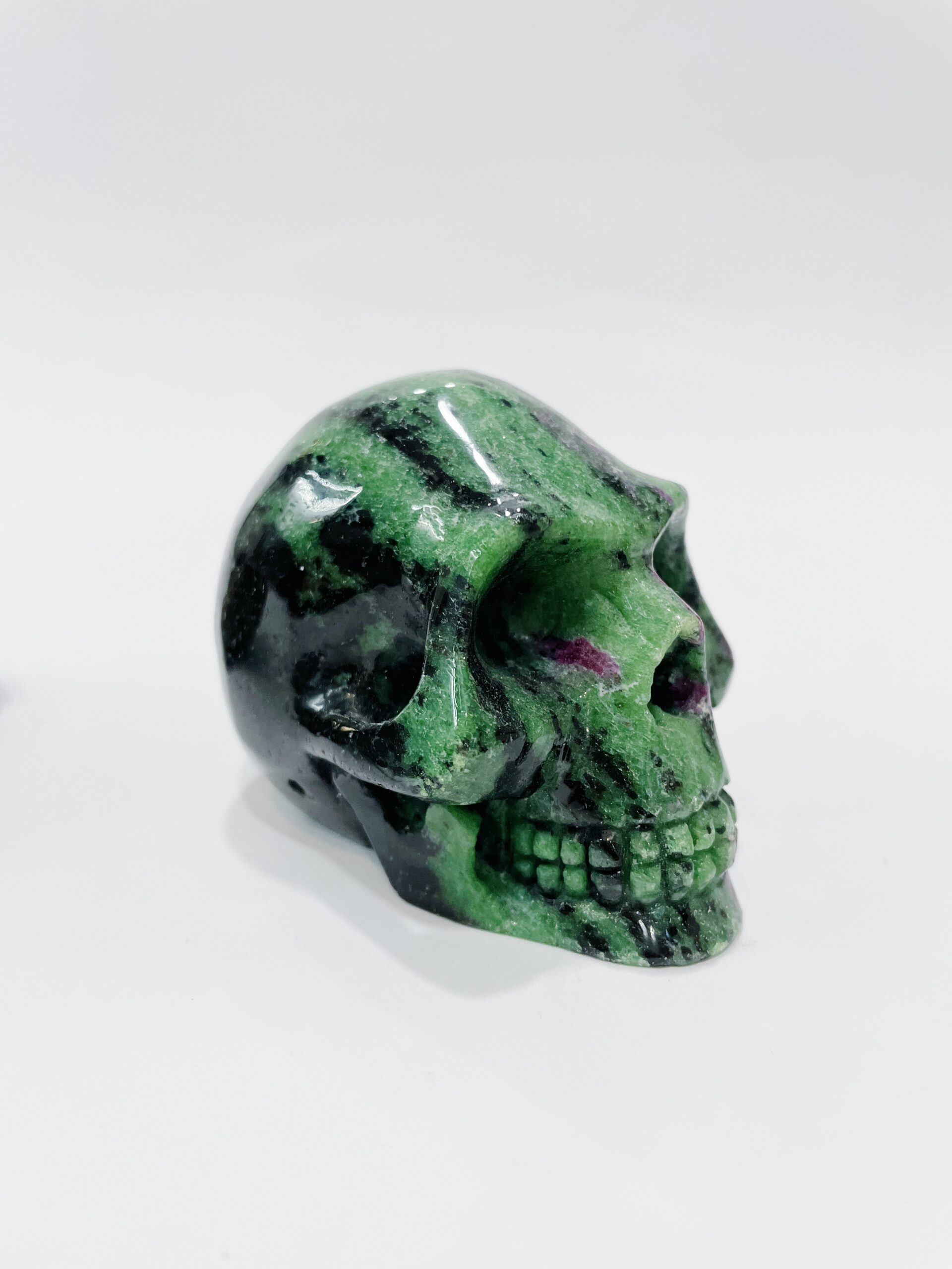 Calavera tallada en zoisita con rubí procedente de India.