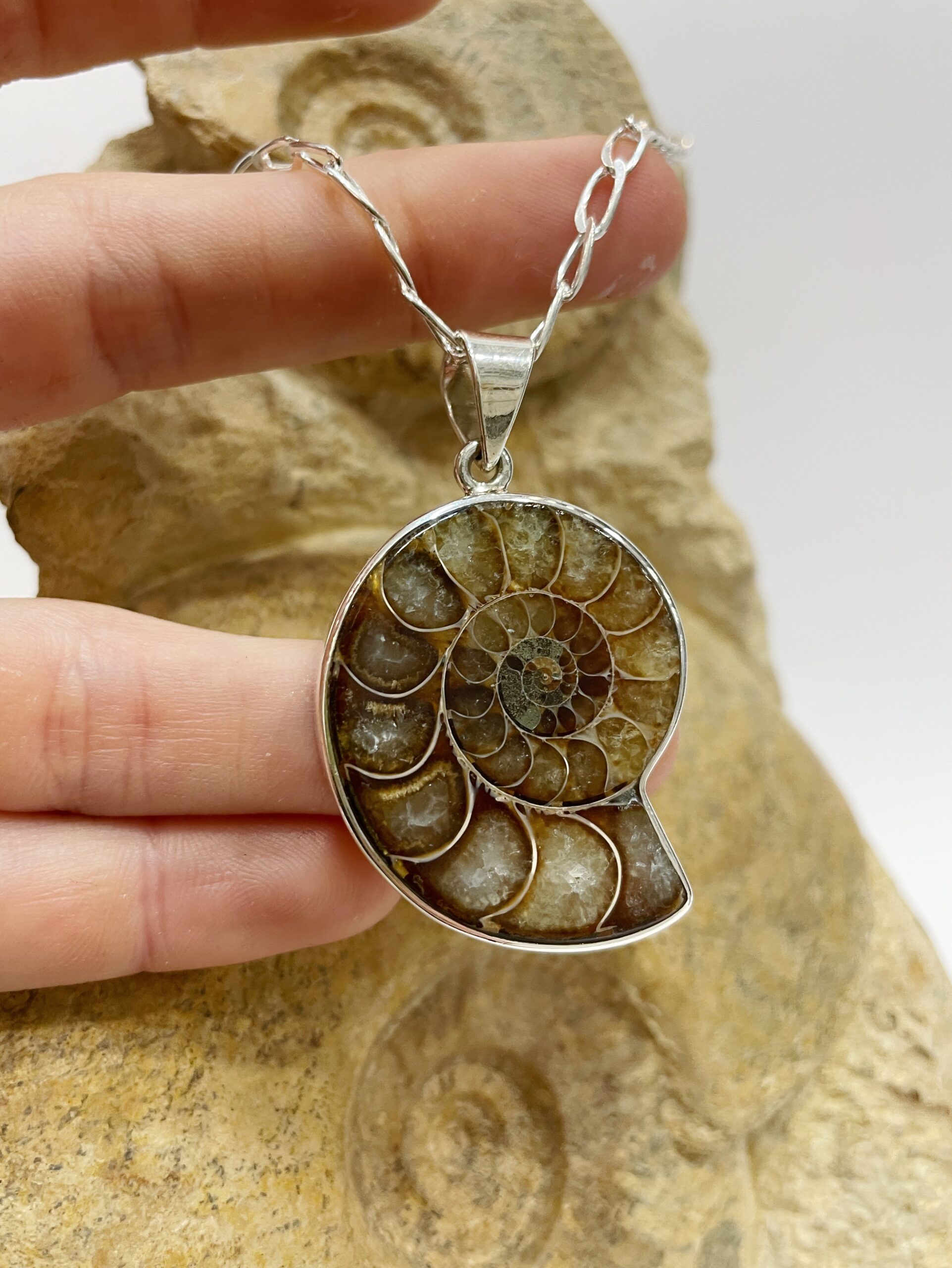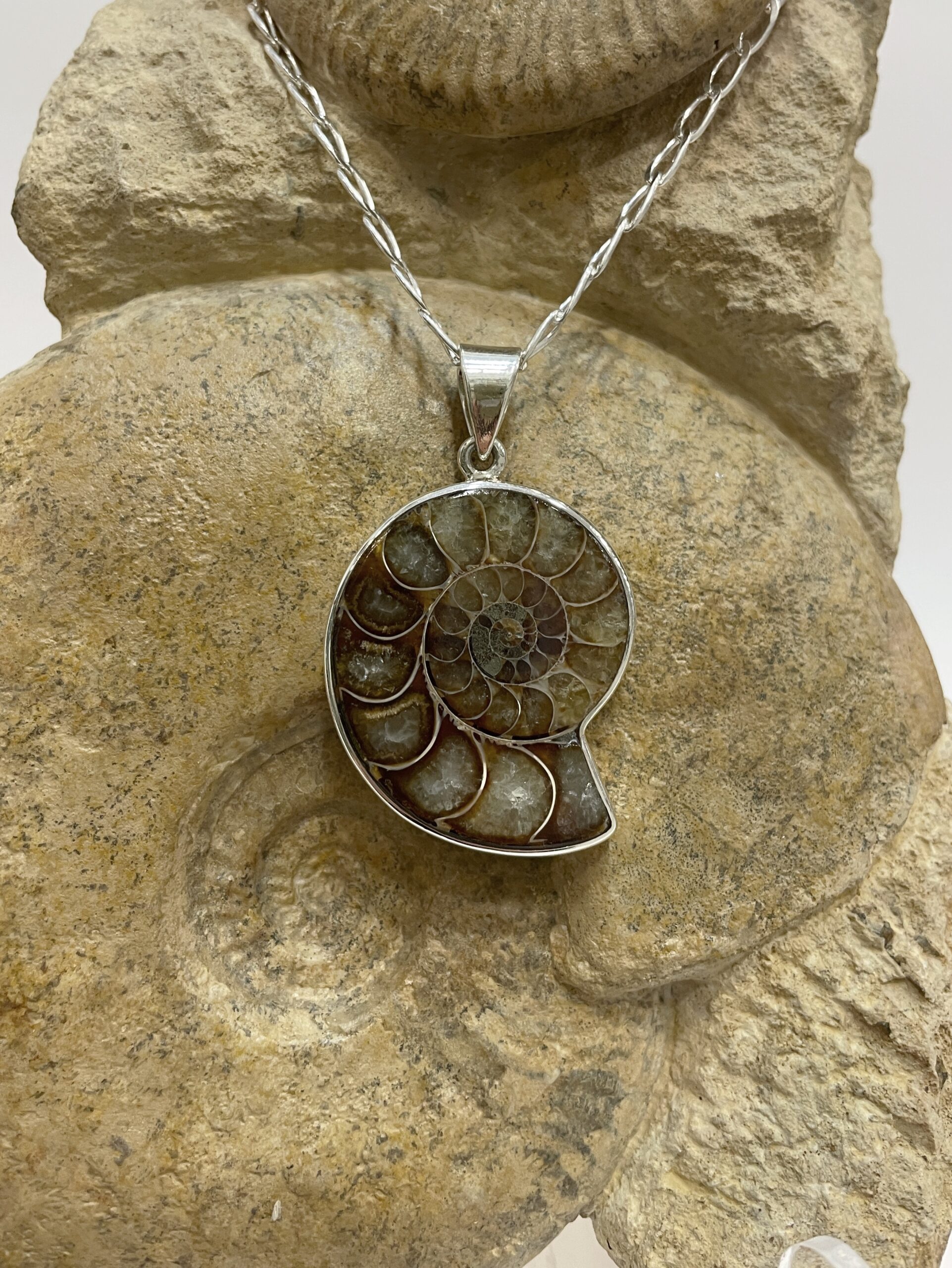 Colgante de ammonites natural engastado en plata de ley 925.