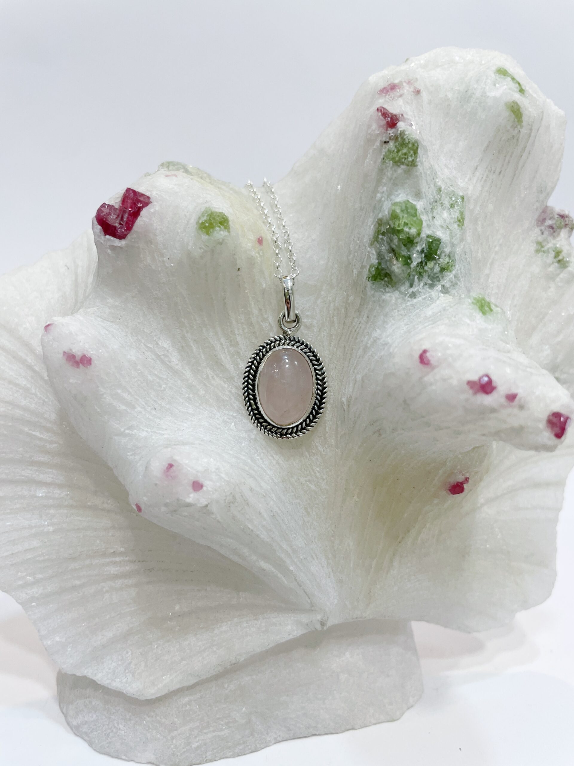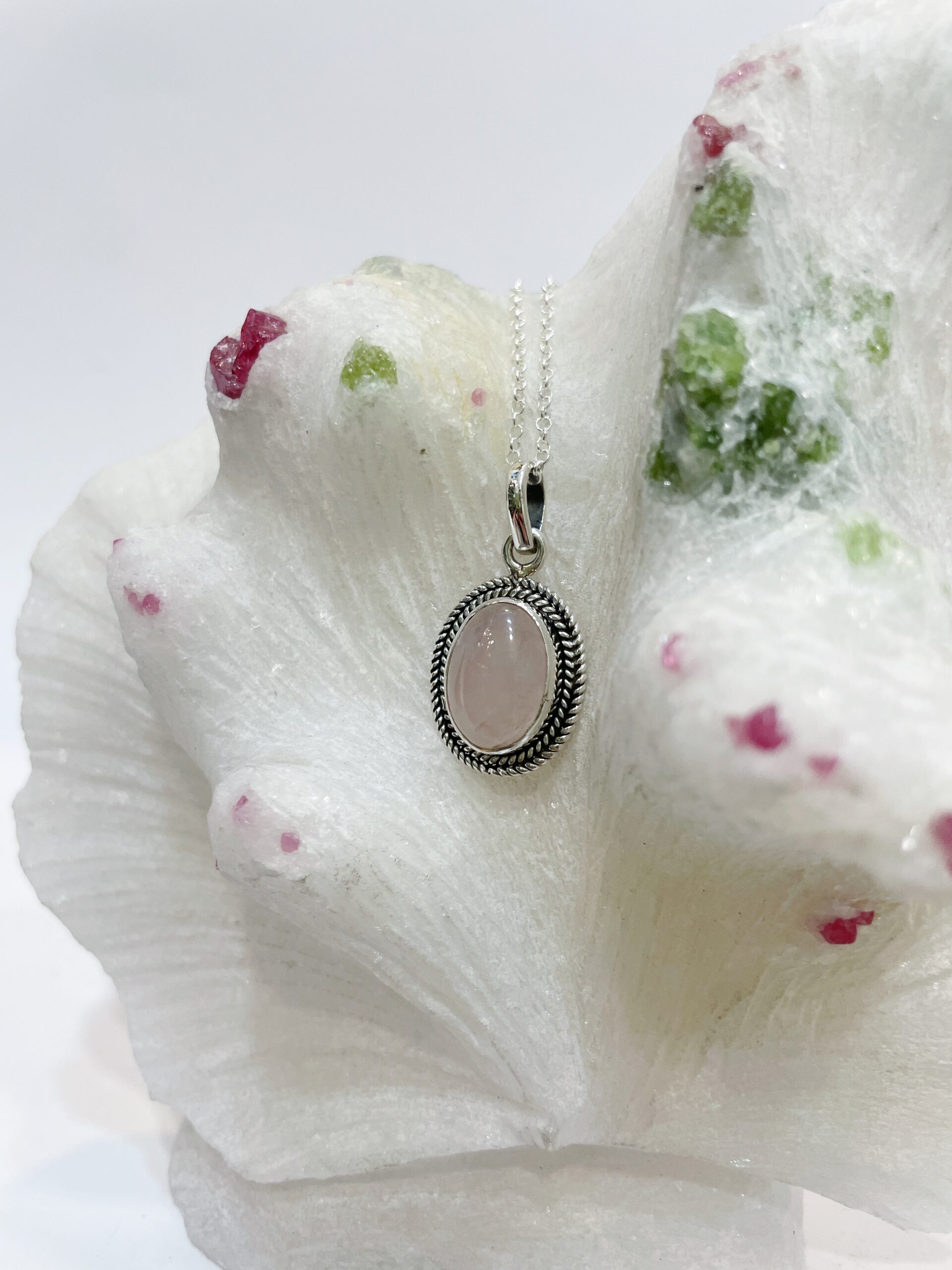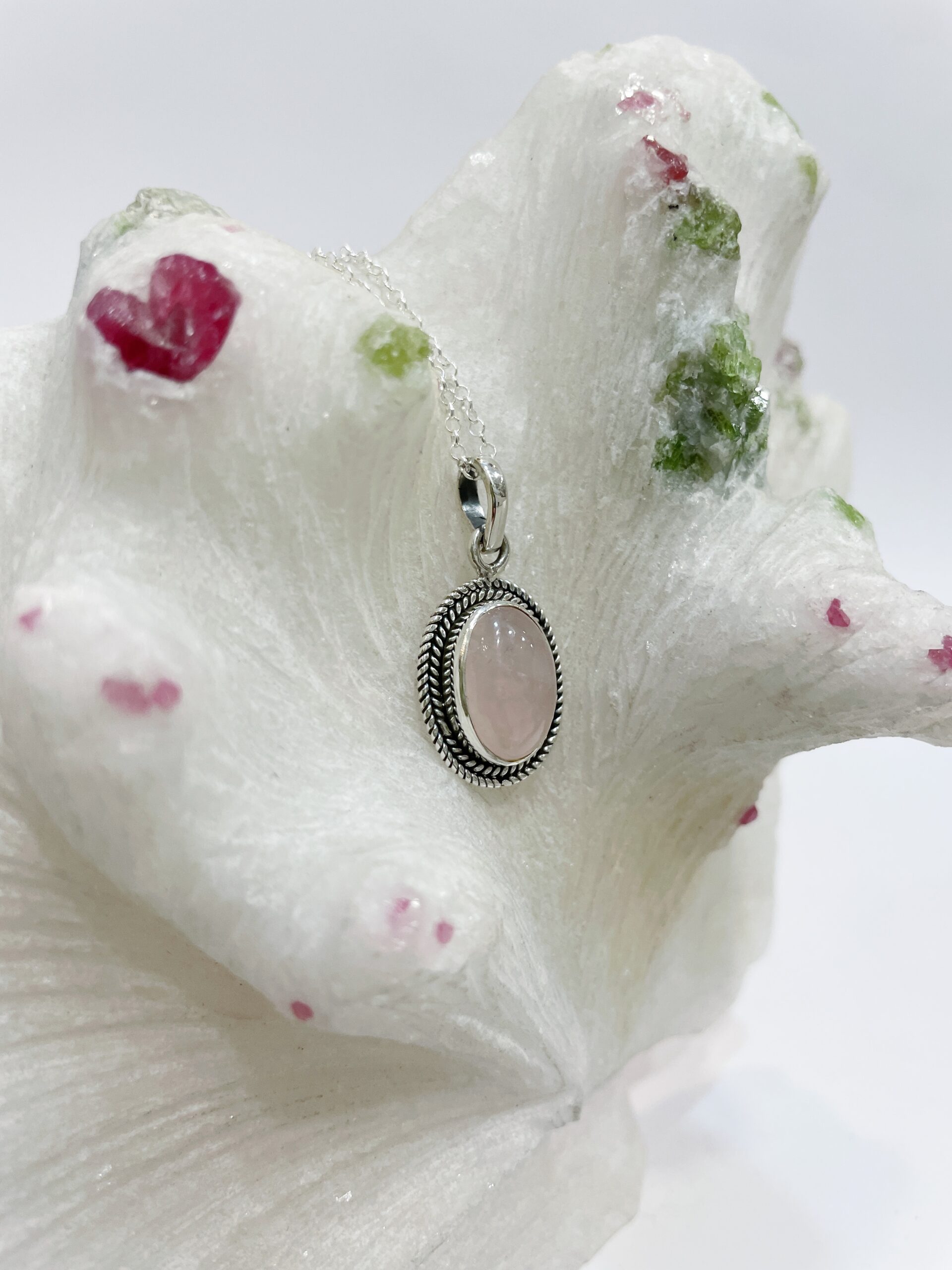 Colgante de cuarzo rosa procedente de Brasil engastado en plata.