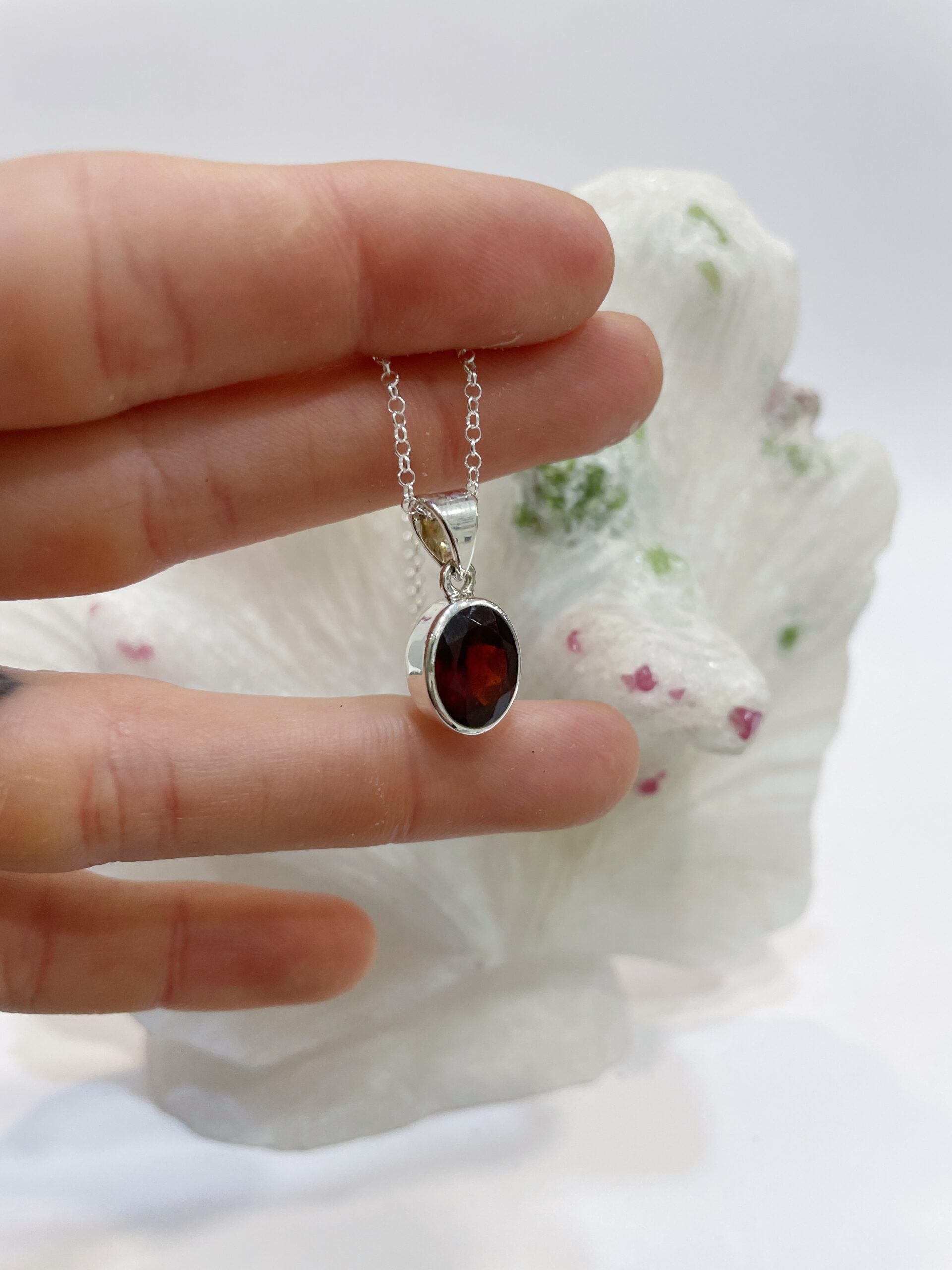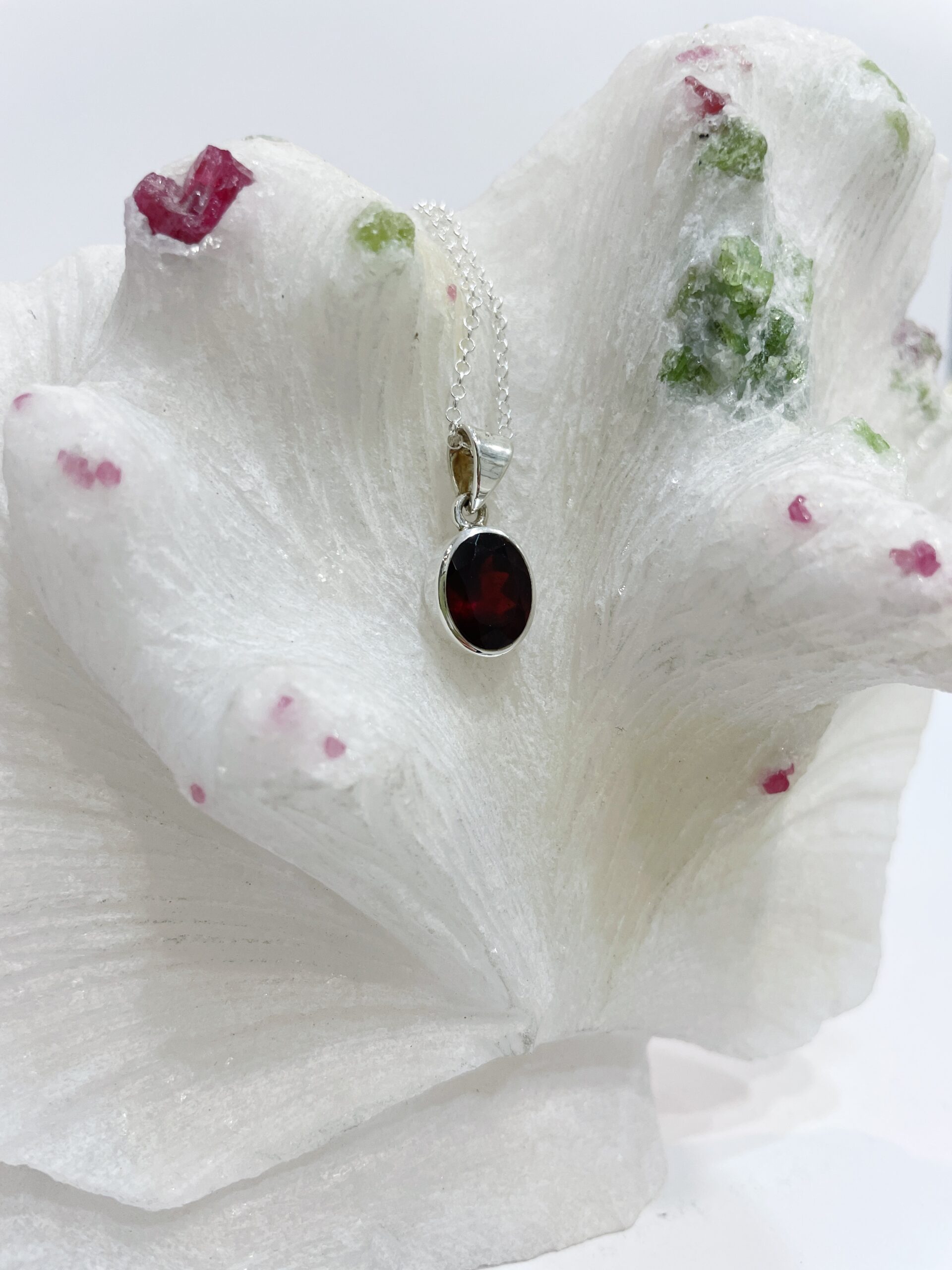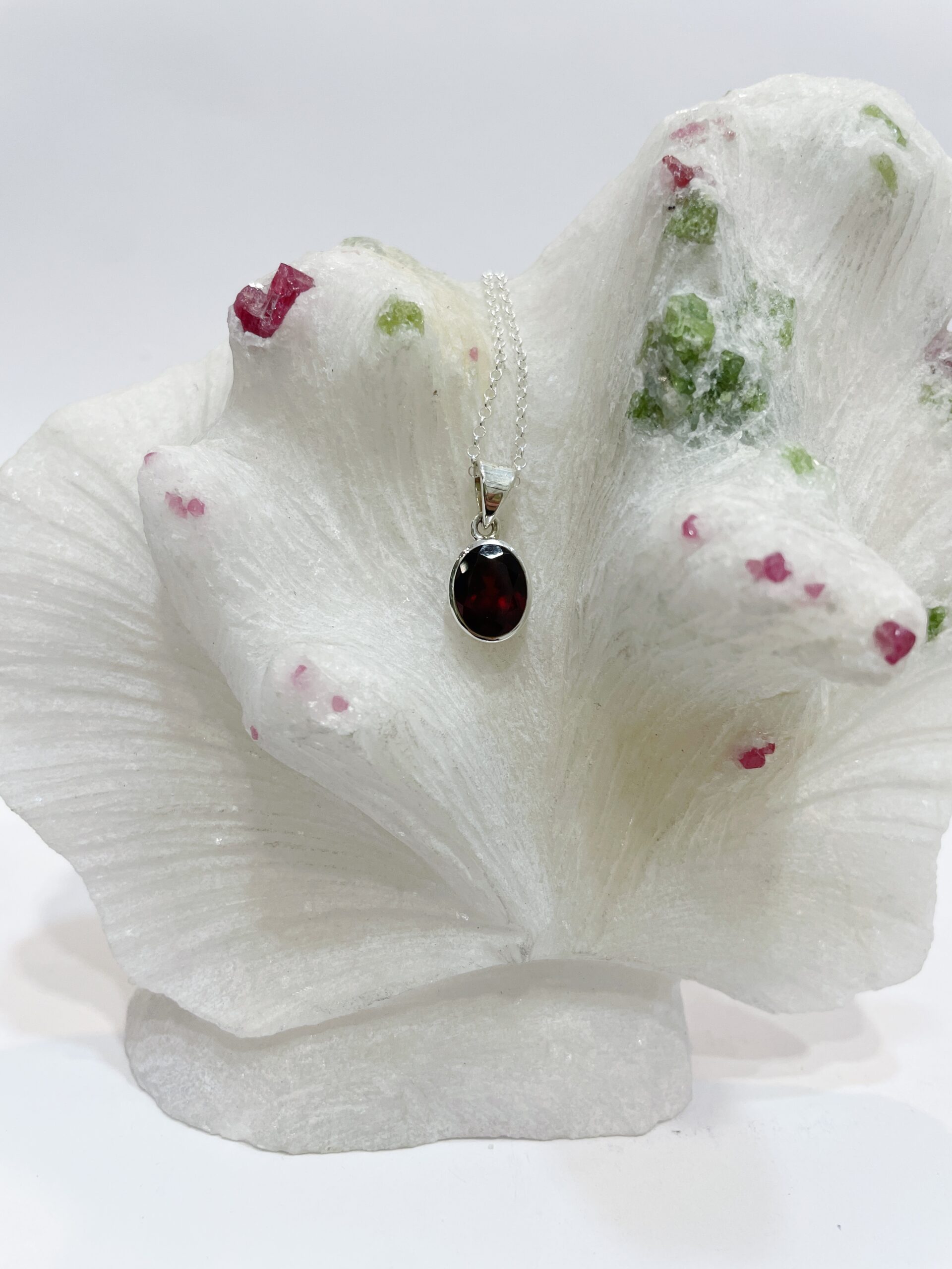 Colgante de granate, natural, cristalizado y facetado, engastado en Plata de Ley 925.