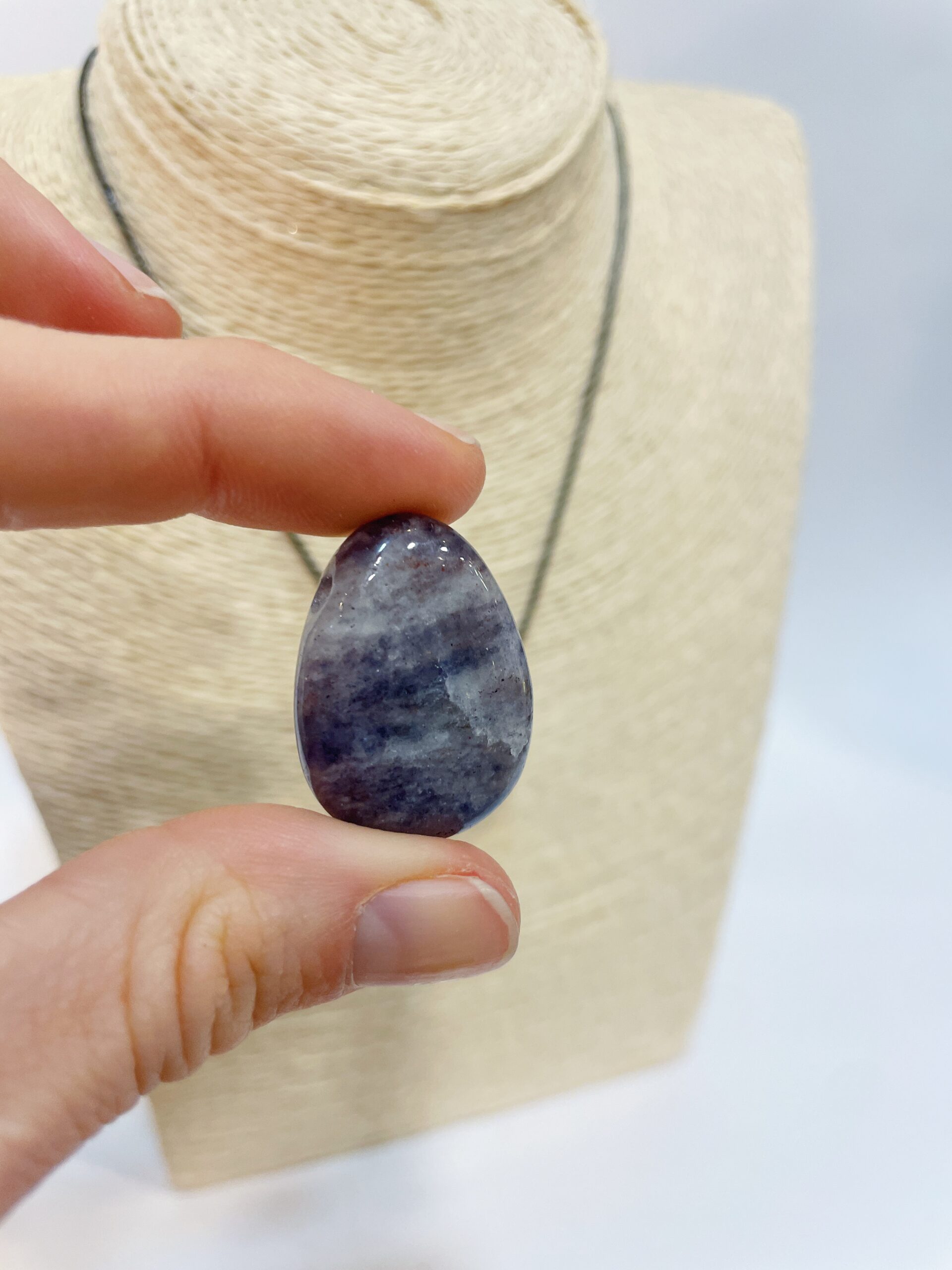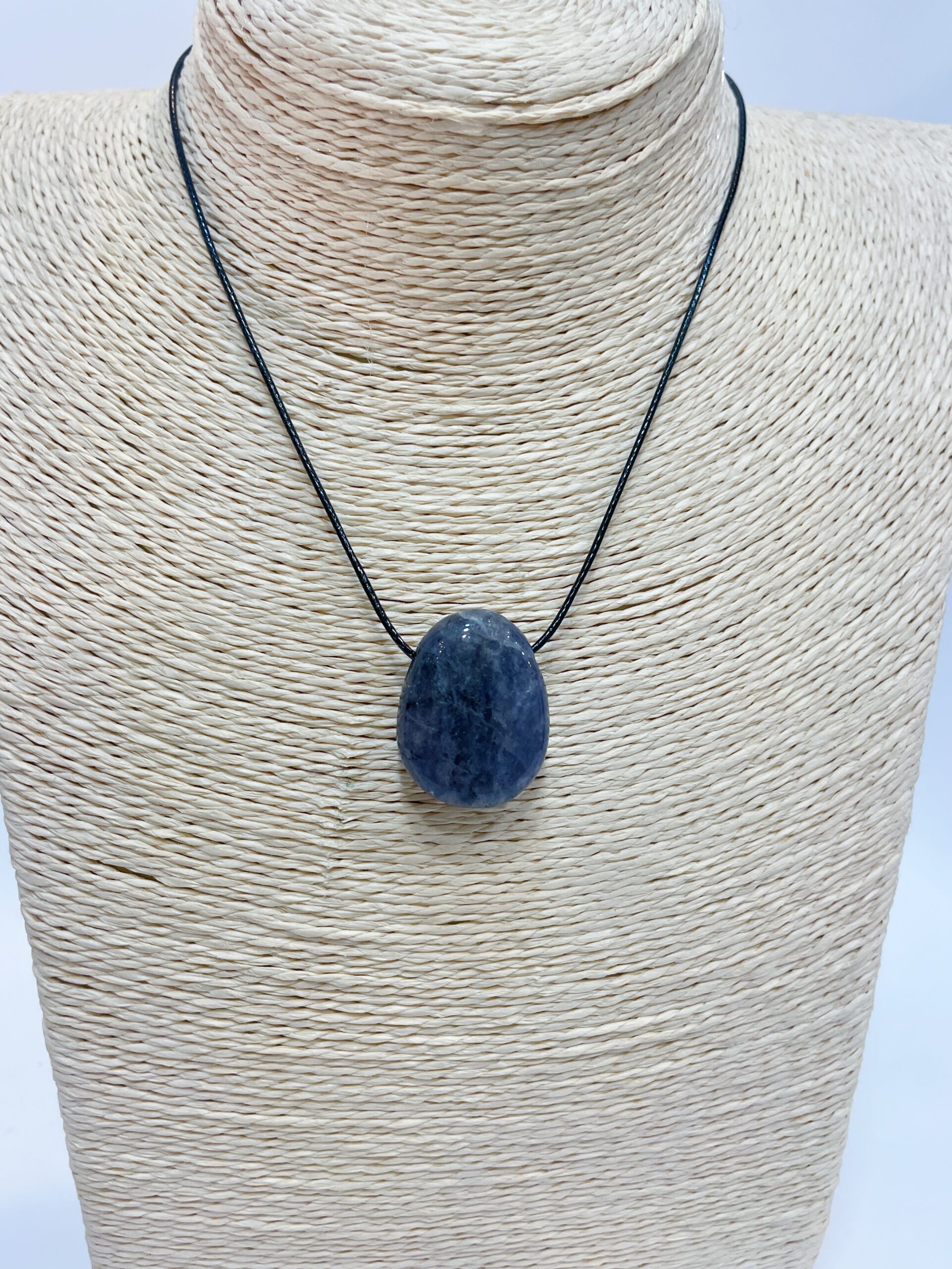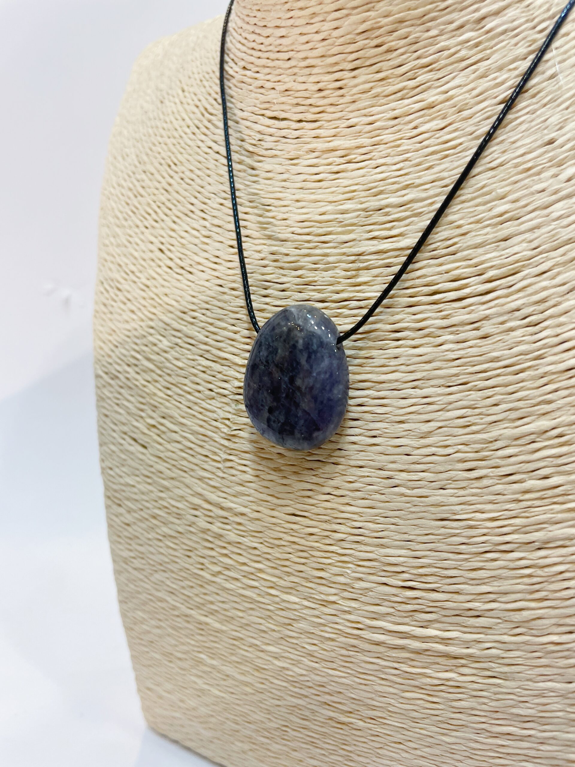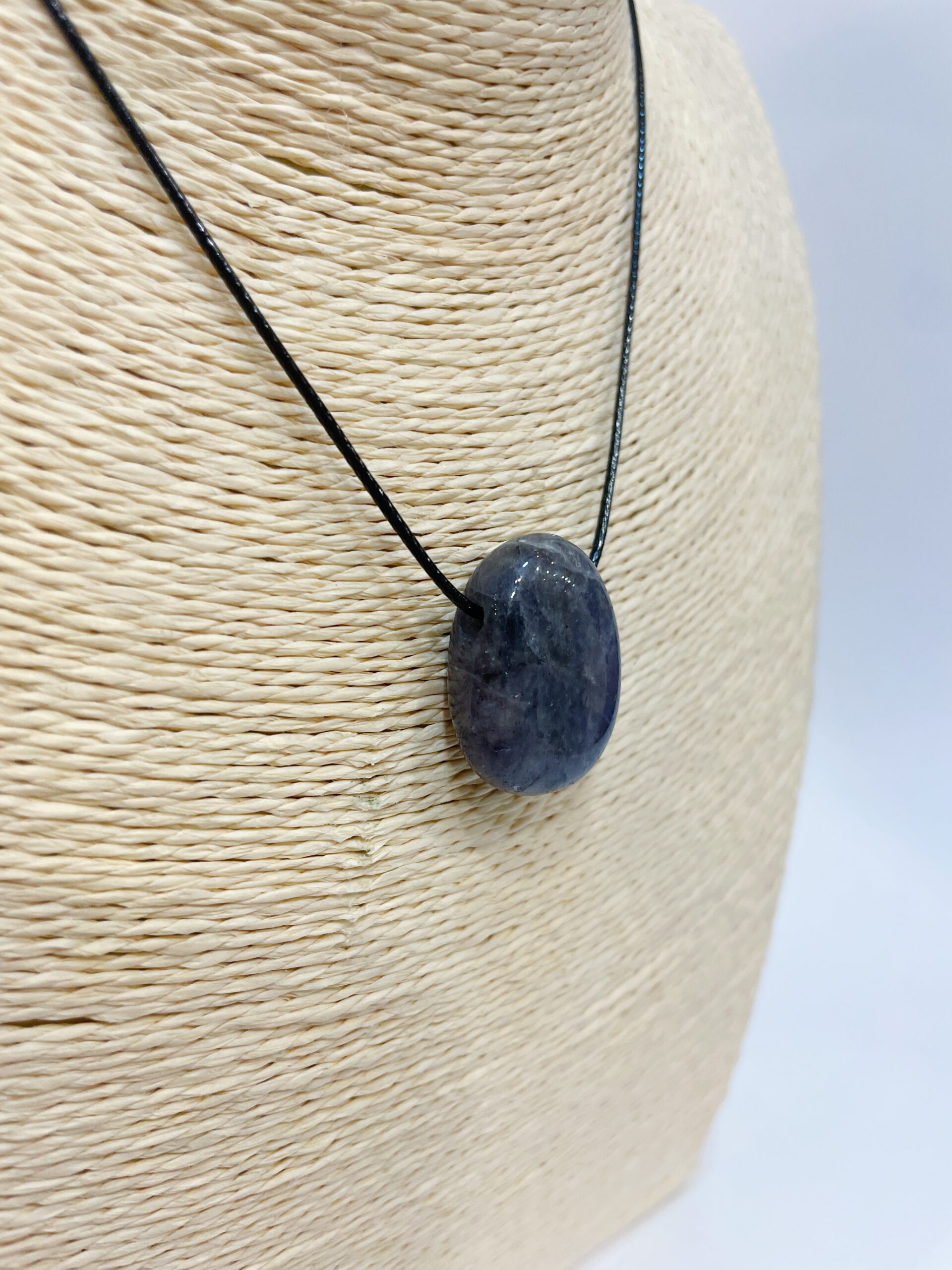 Rodado perforado de iolita natural. Lo entregamos con cordón negro de algodón encerado como el de la foto, con nudo corredizo ajustable.
