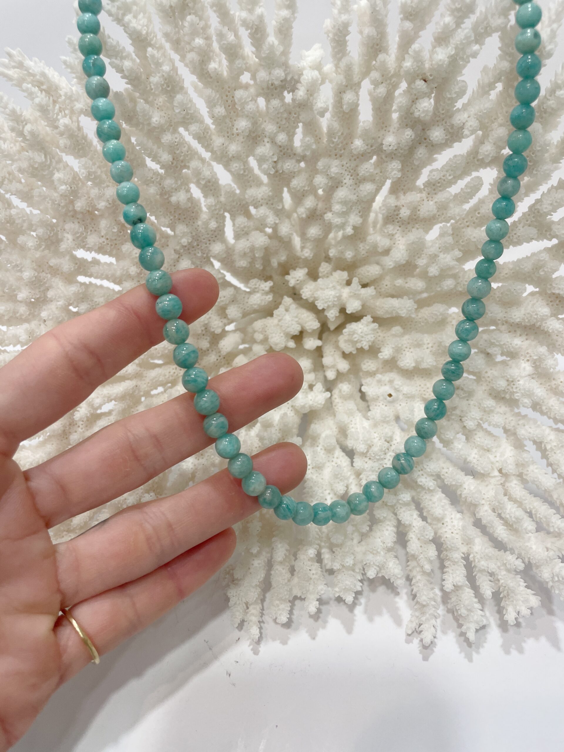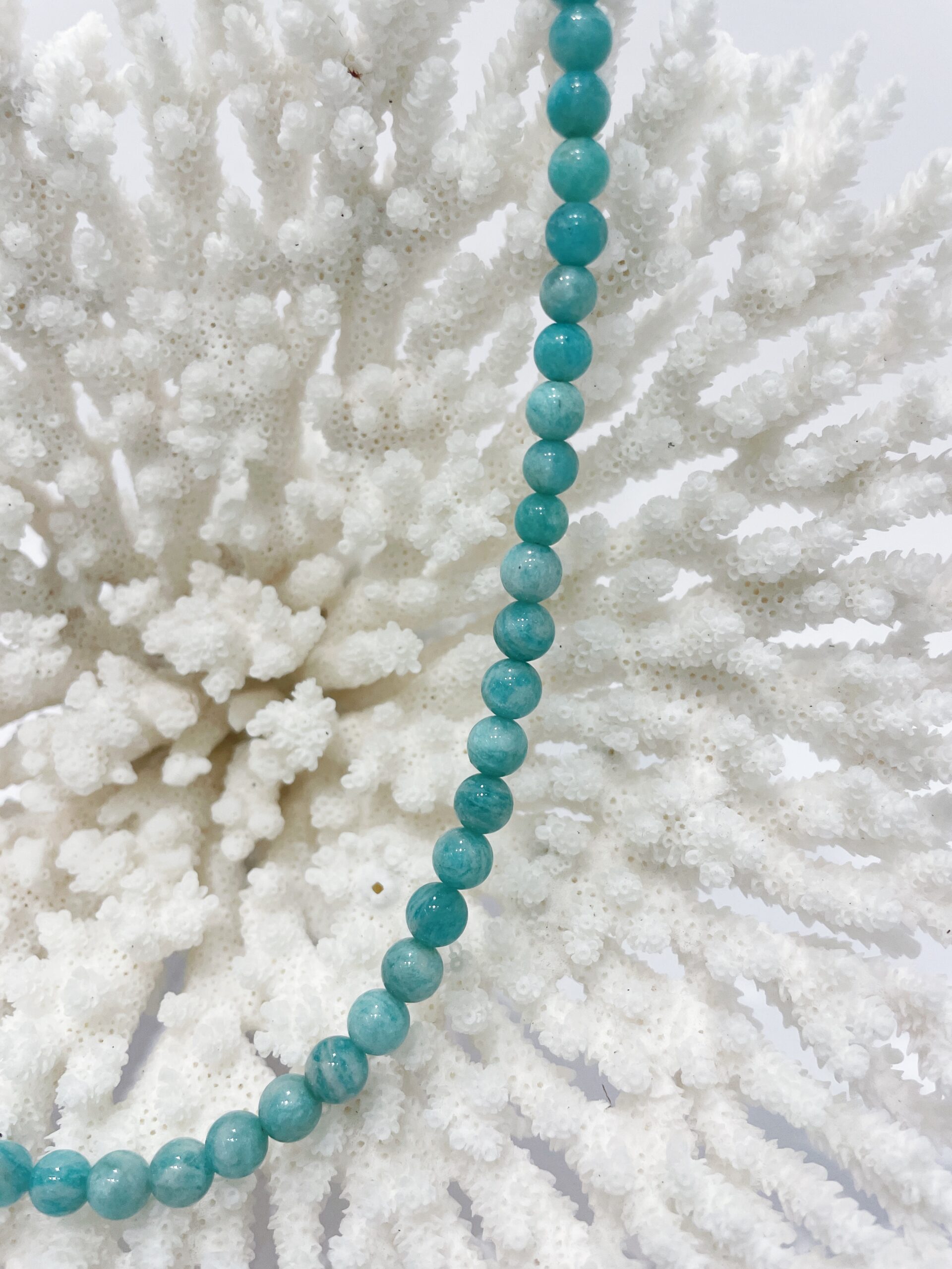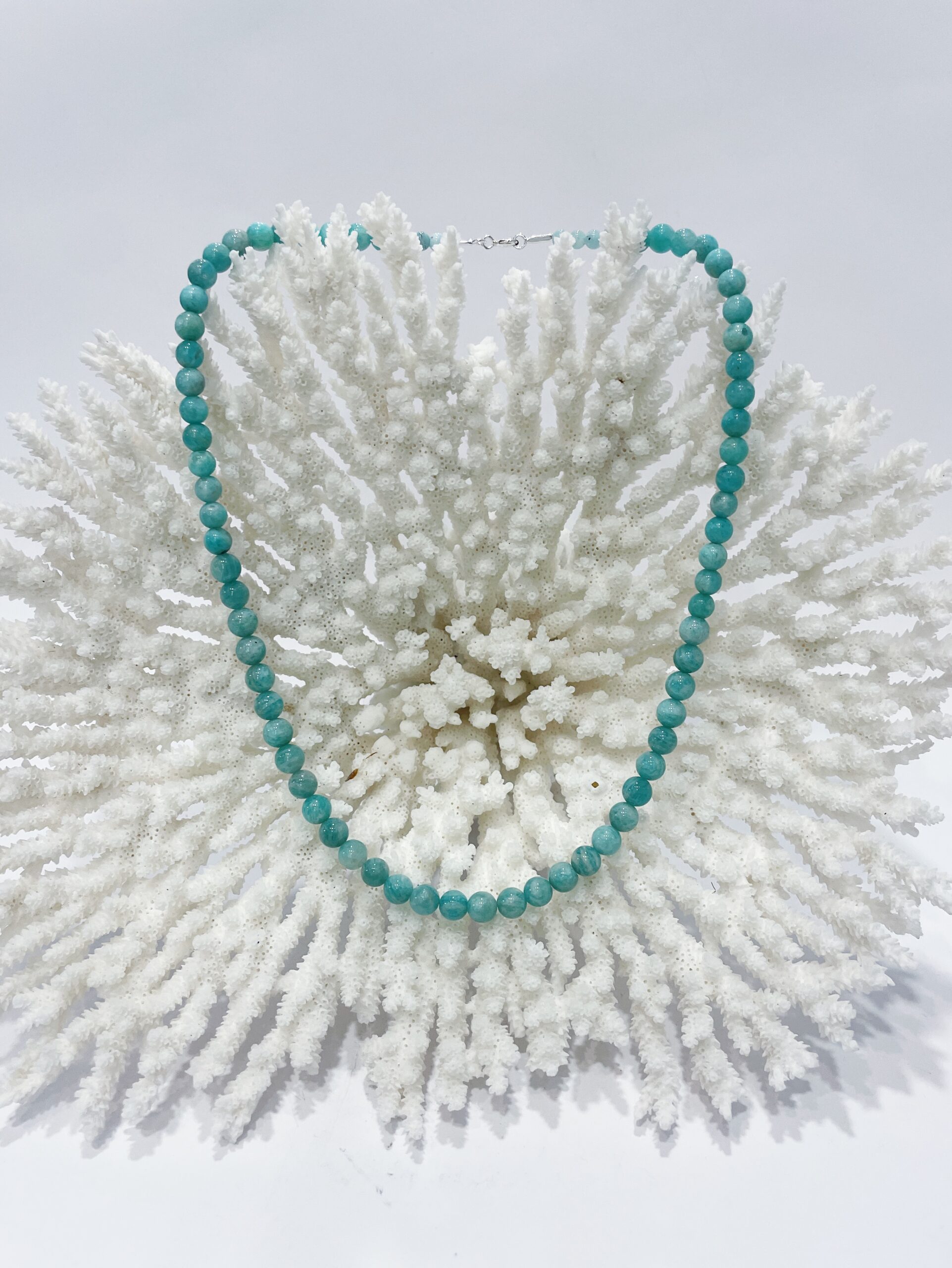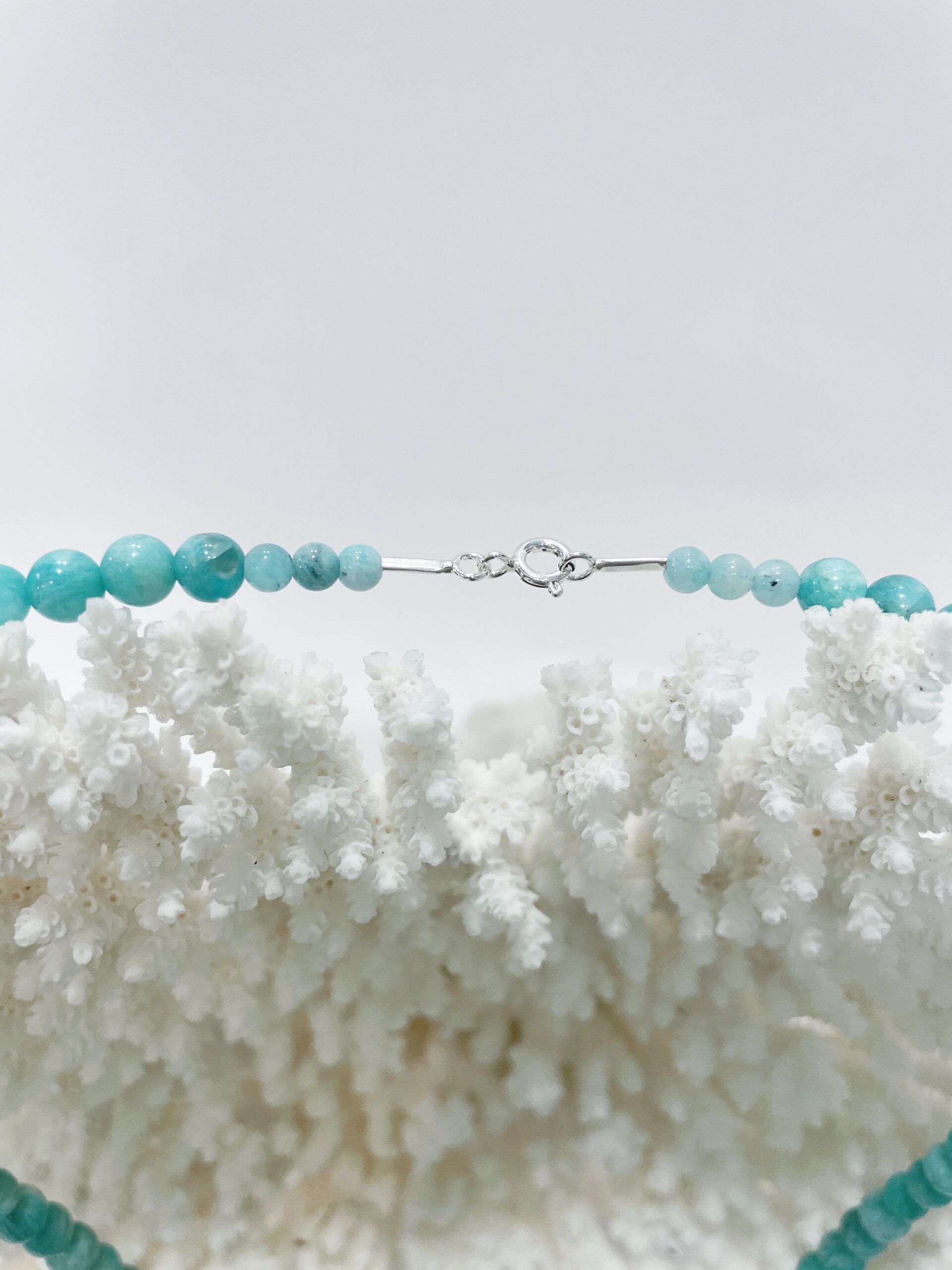 Collar de amazonita natural en diferente tonalidades de verde enfilado en acero con cierre de plata de ley.