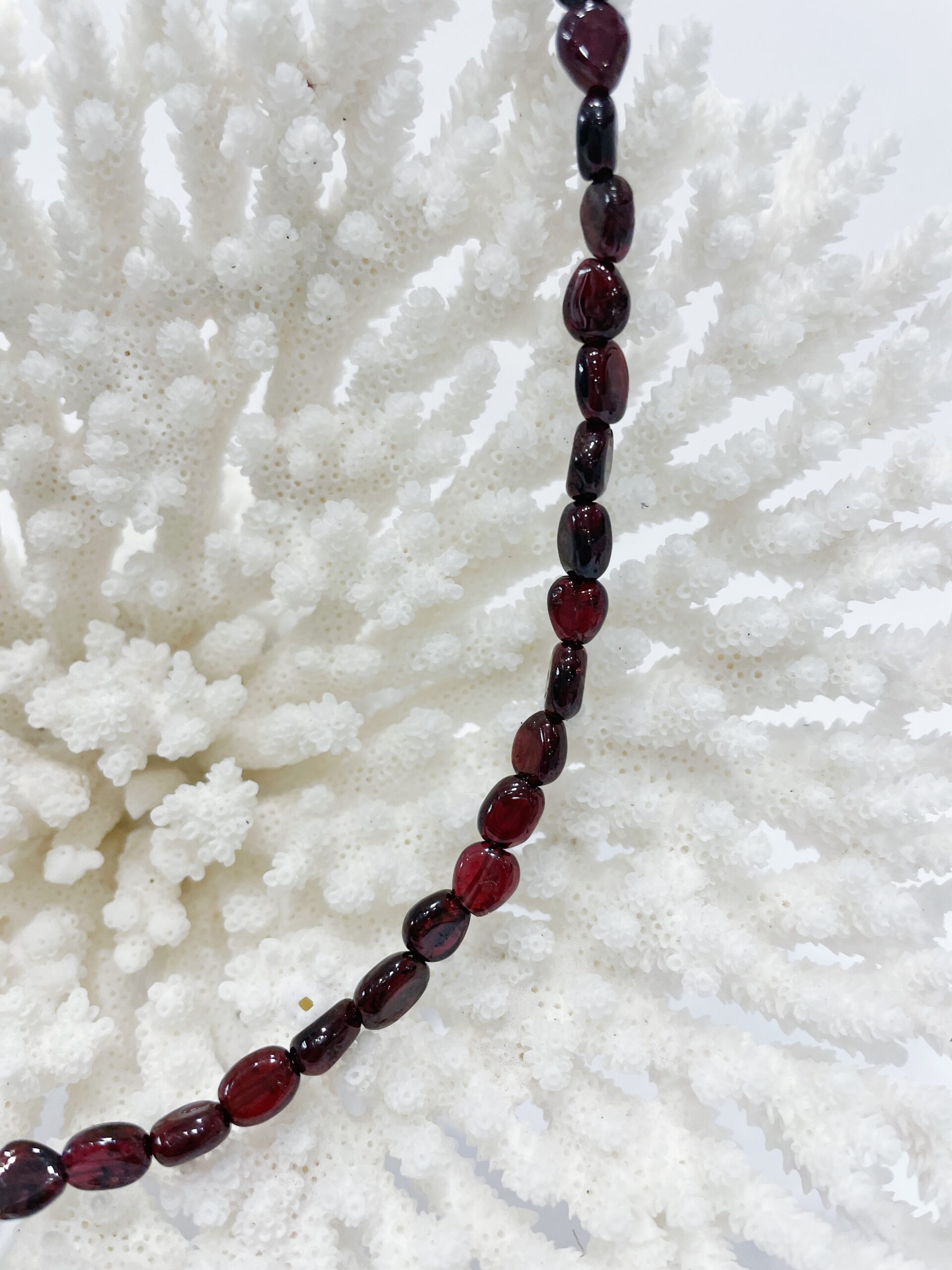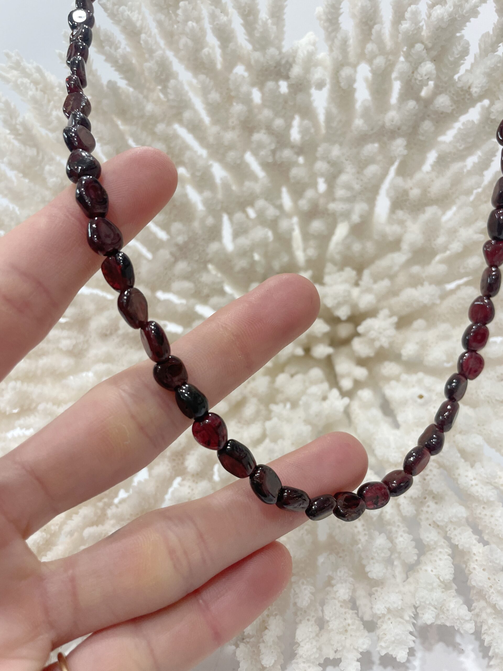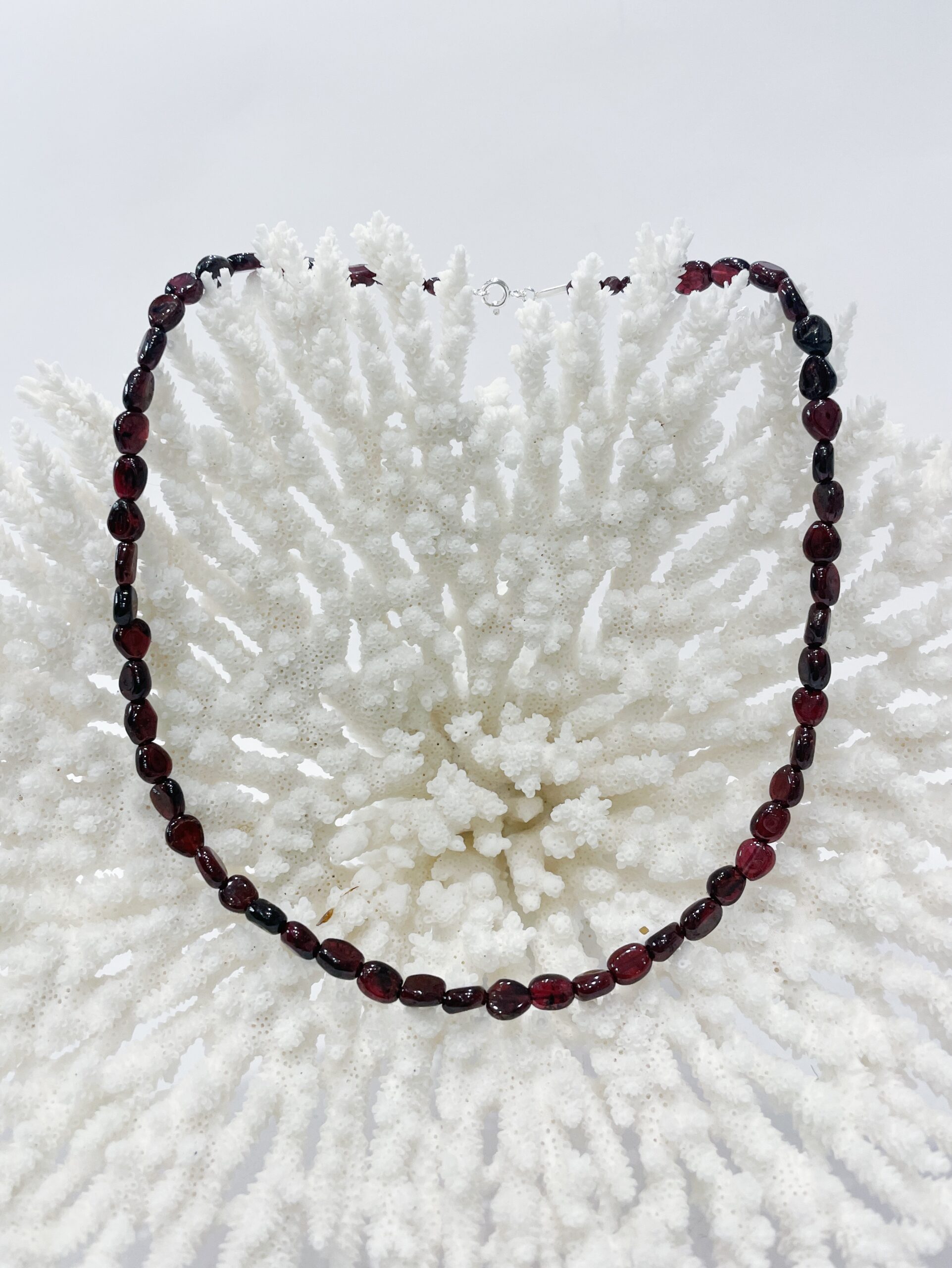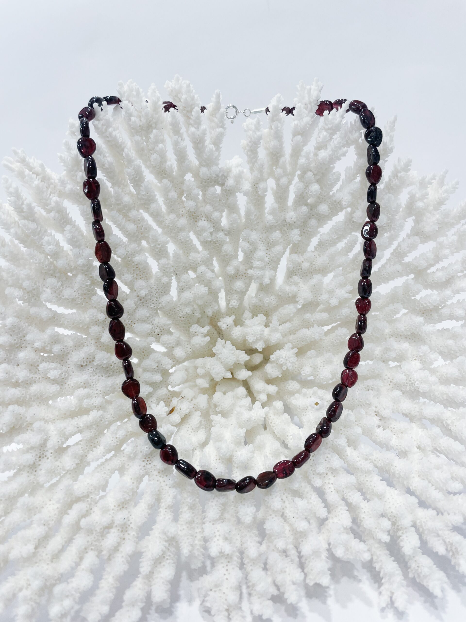 Collar de granate natural enfilado en acero con cierre de plata de ley.