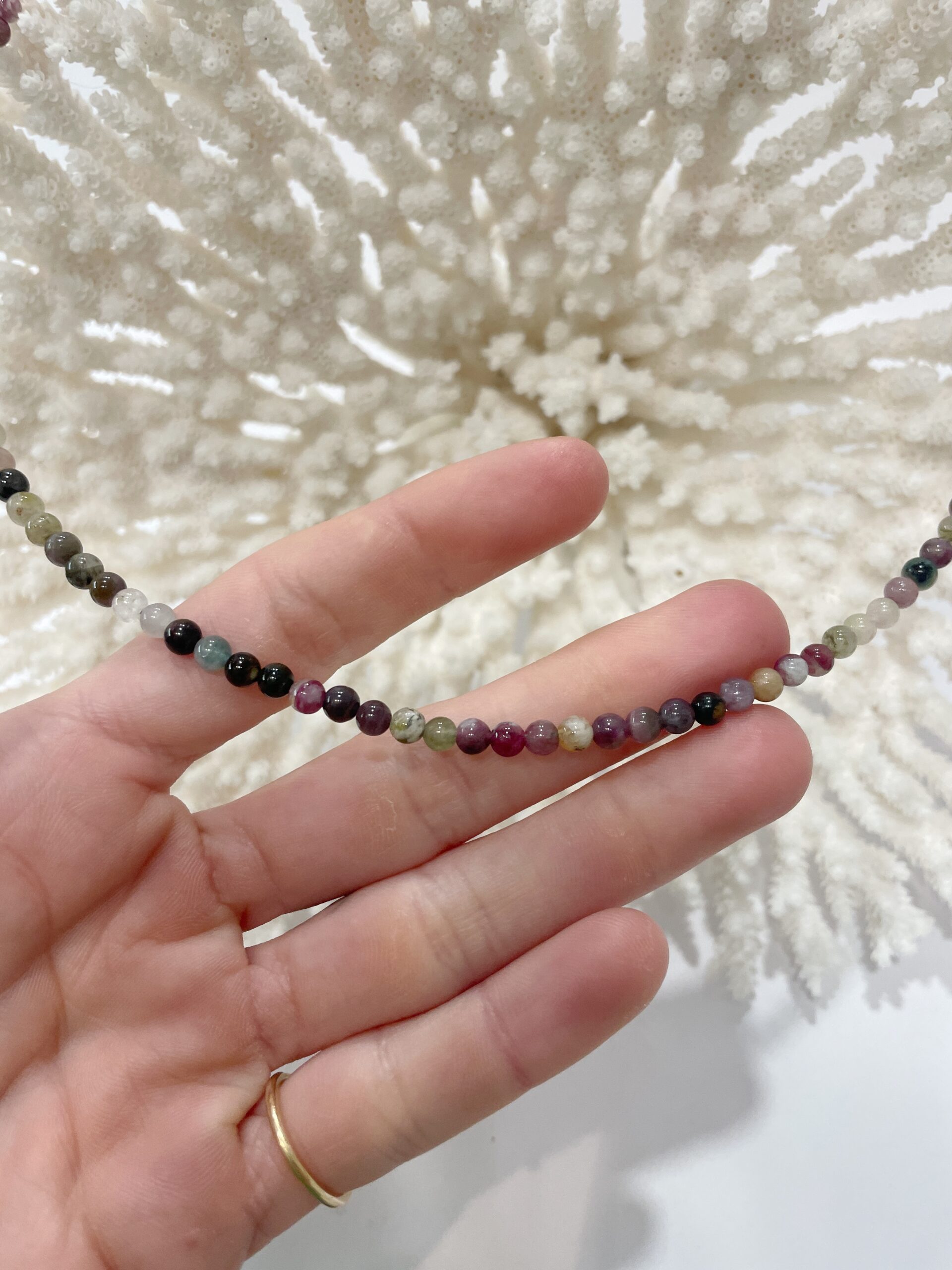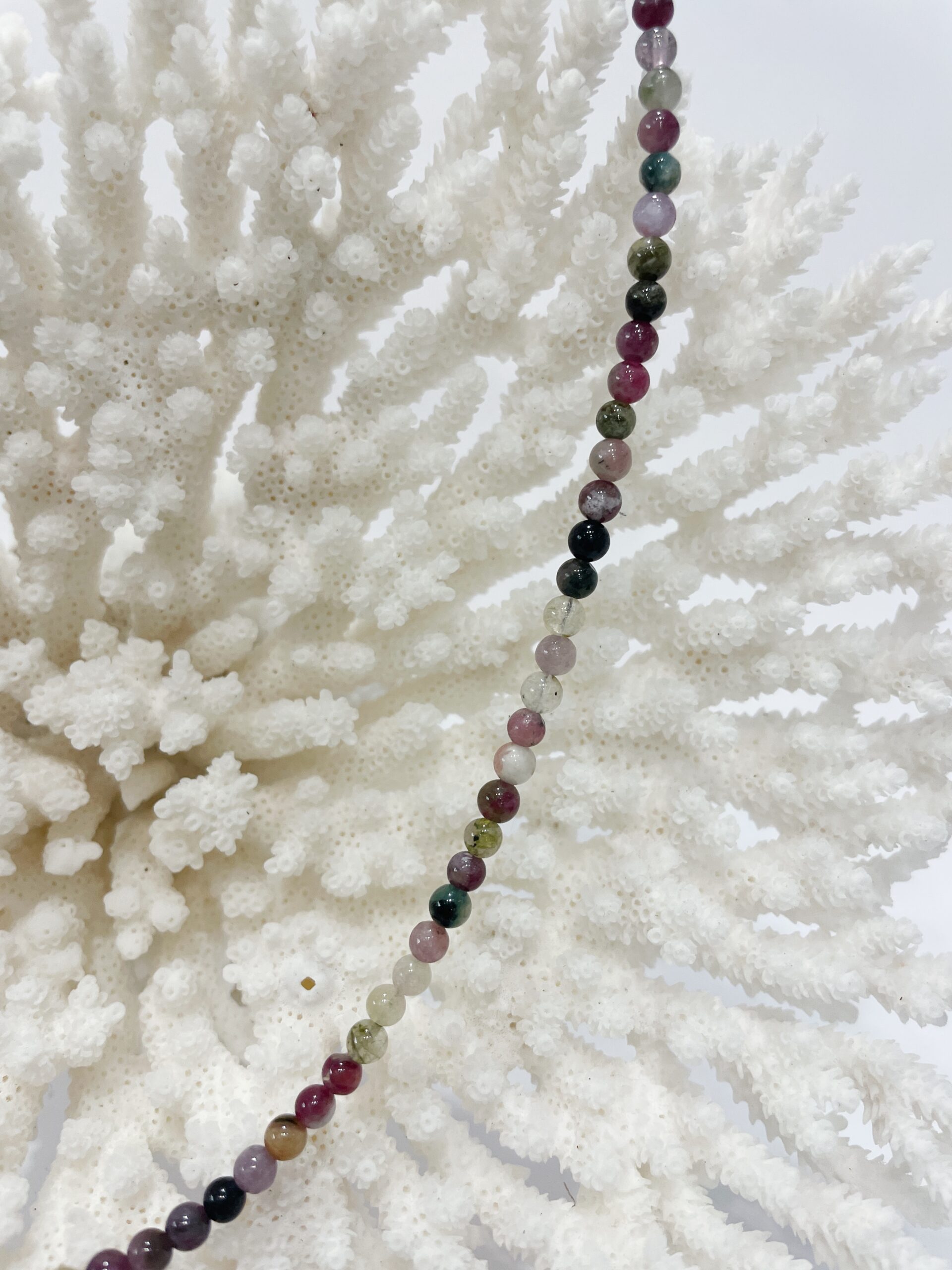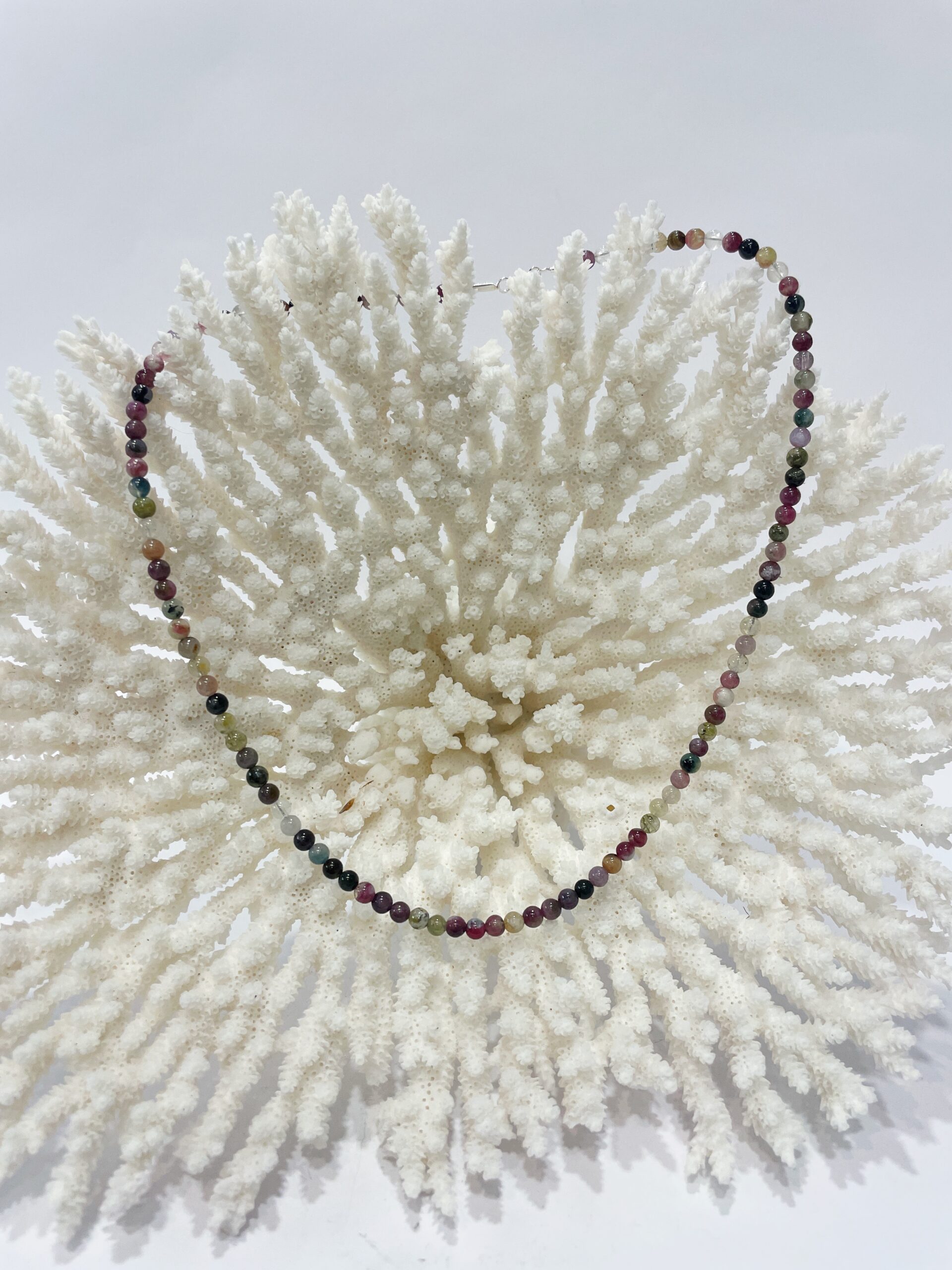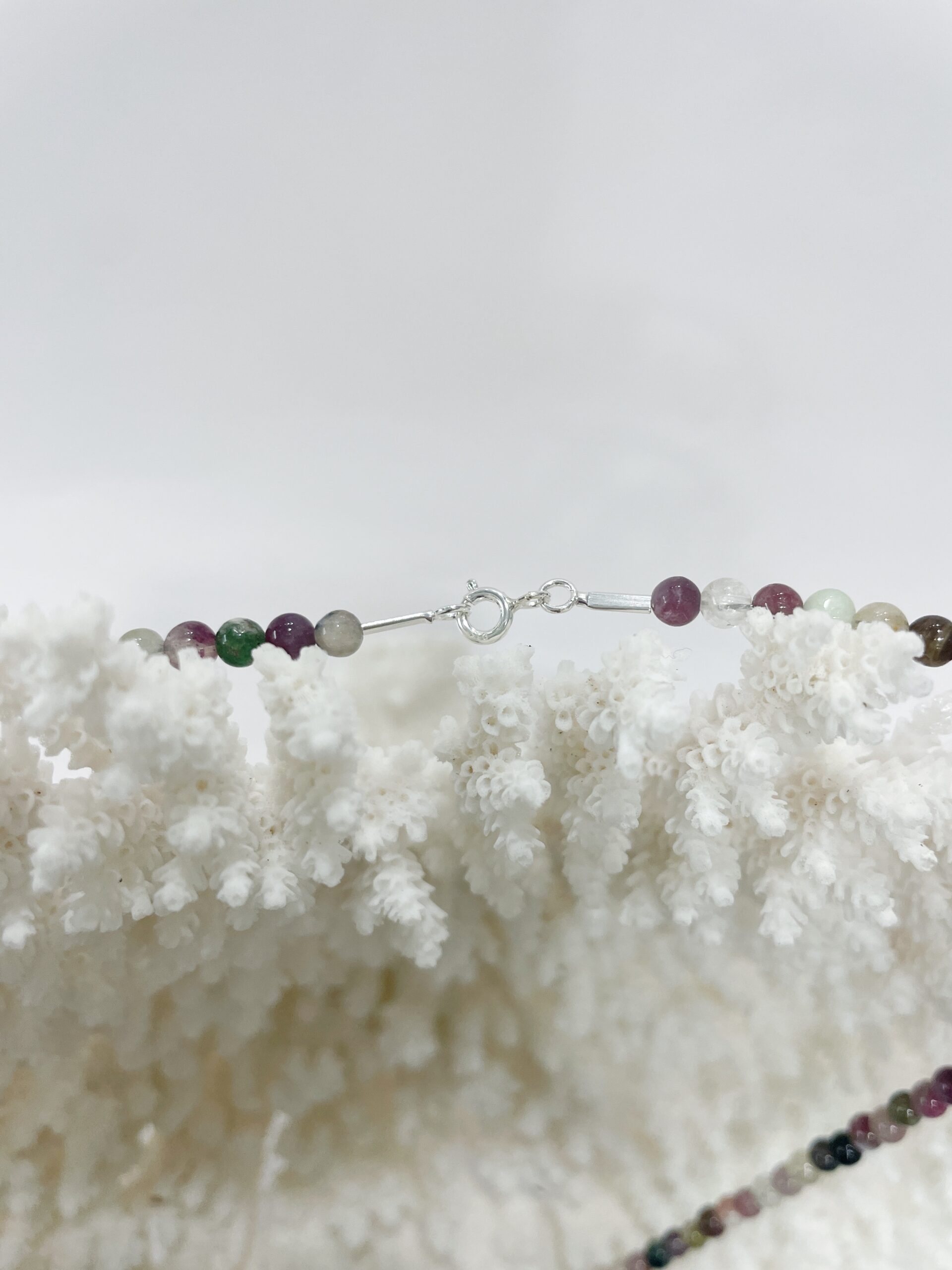 Collar fino de turmalinas en cuarzo, naturales, en diferente tonalidades. Enfilado en acero con cierre de plata de ley.