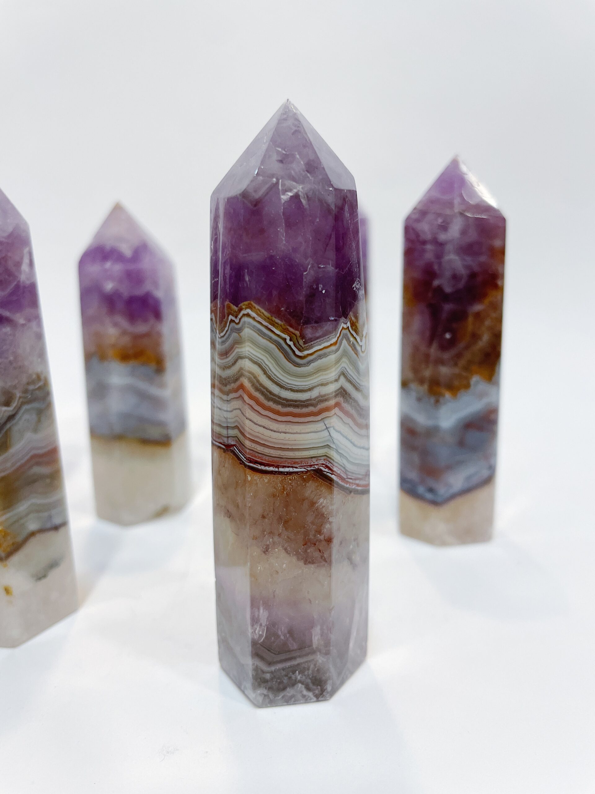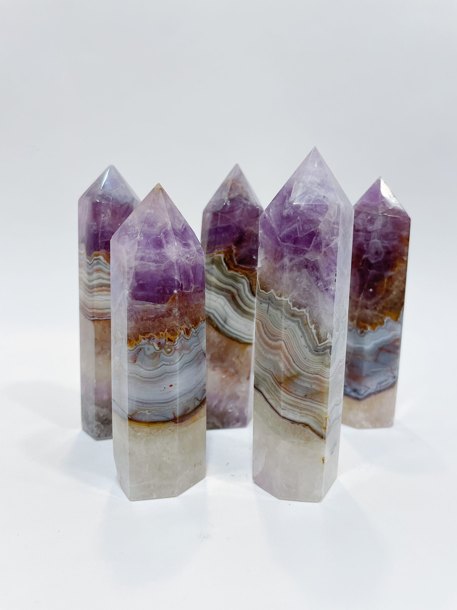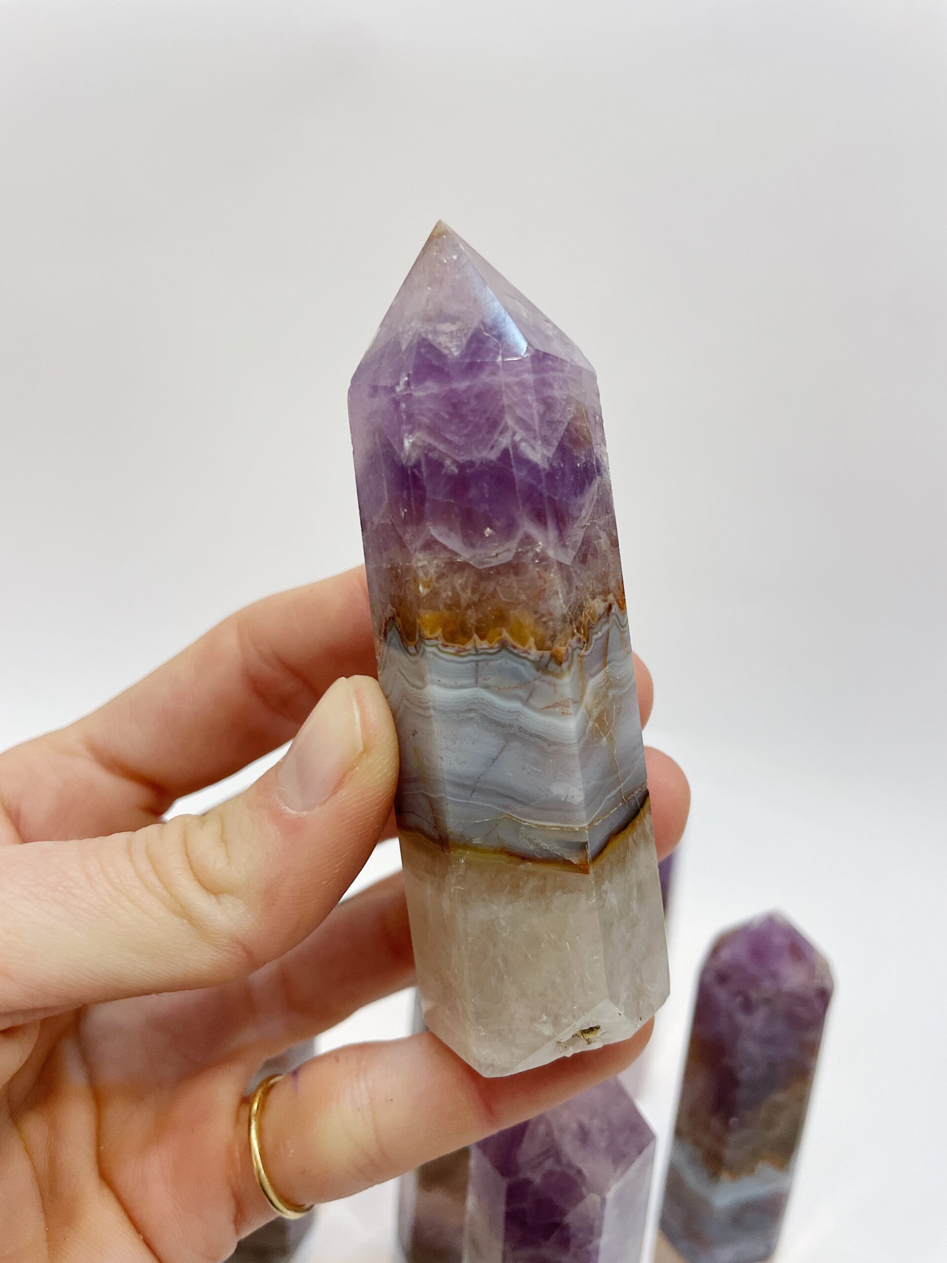 Punta de Amatista y ágata bandeada, también llamada lazo loco, pulida, procedente de Brasil.